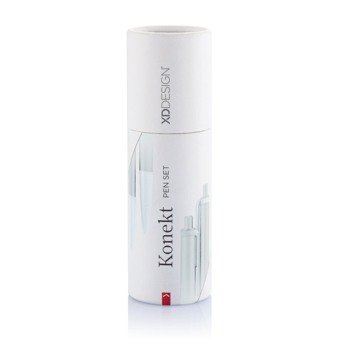 Konekt brings an aluminum ballpoint pen and a rollerball pen closer together by connecting the clips. The pens are both delivered with a blue and black refill. Registered design®