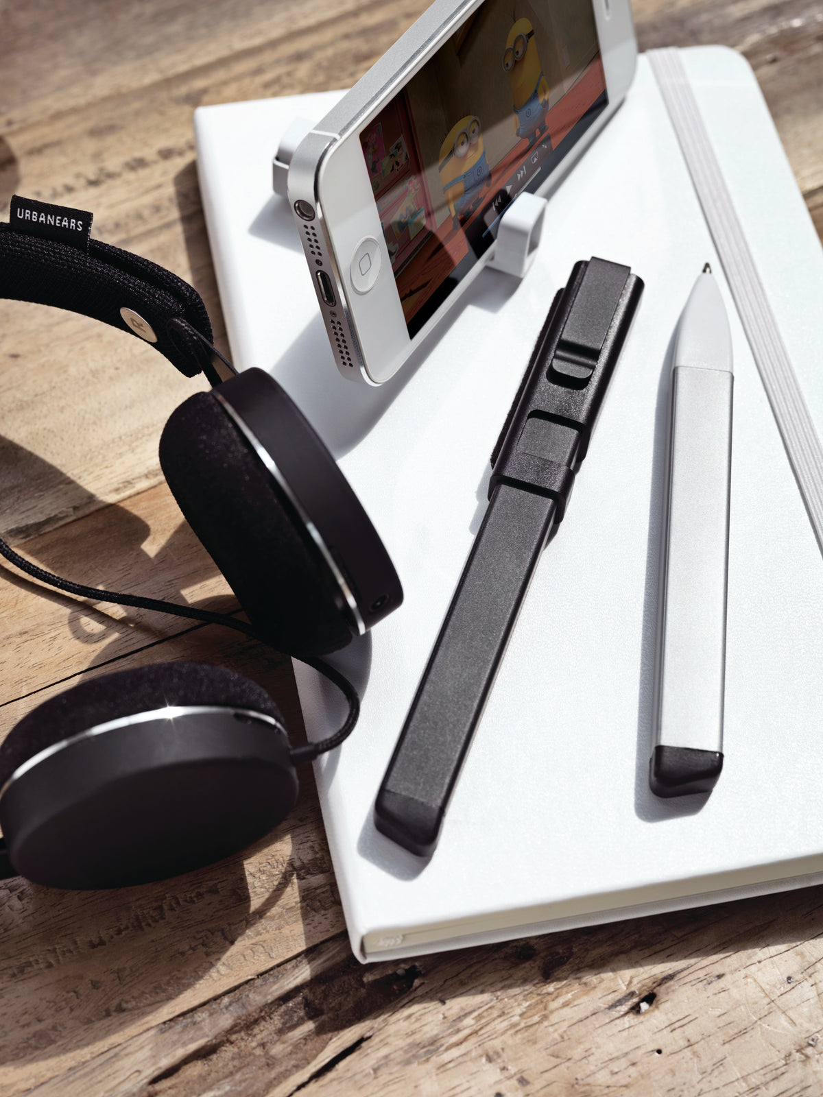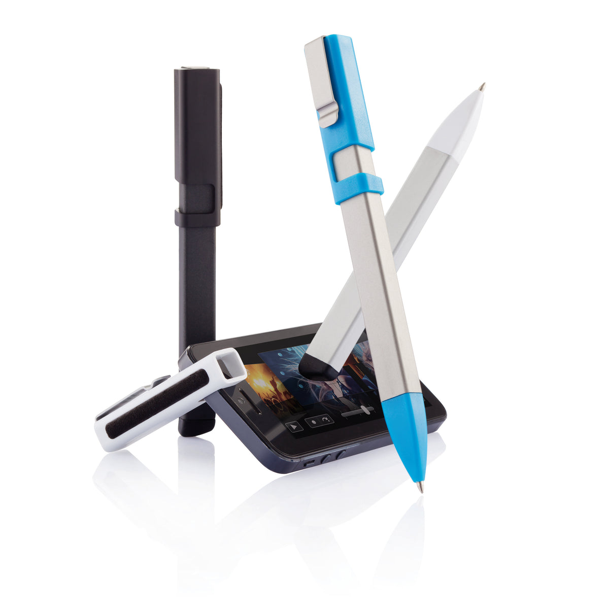 Kube combines all your daily mobile needs in one aluminum stylus pen. The clip is designed to hold your mobile phone and cleans your screen. The pen comes with a blue and black refill. Registered design®