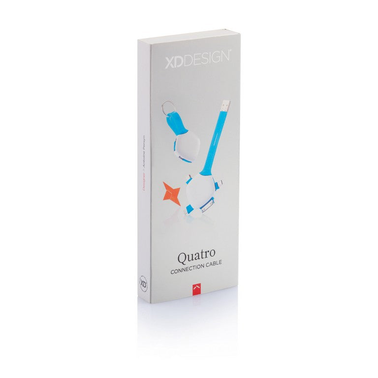 The Quatro brings the 4 most common plugs into just one cable: Apple Lightning, Apple Dock, Micro USB and Mini USB. Now you can have them all together on a handy keychain so you'll never be without the right connector. Registered design®